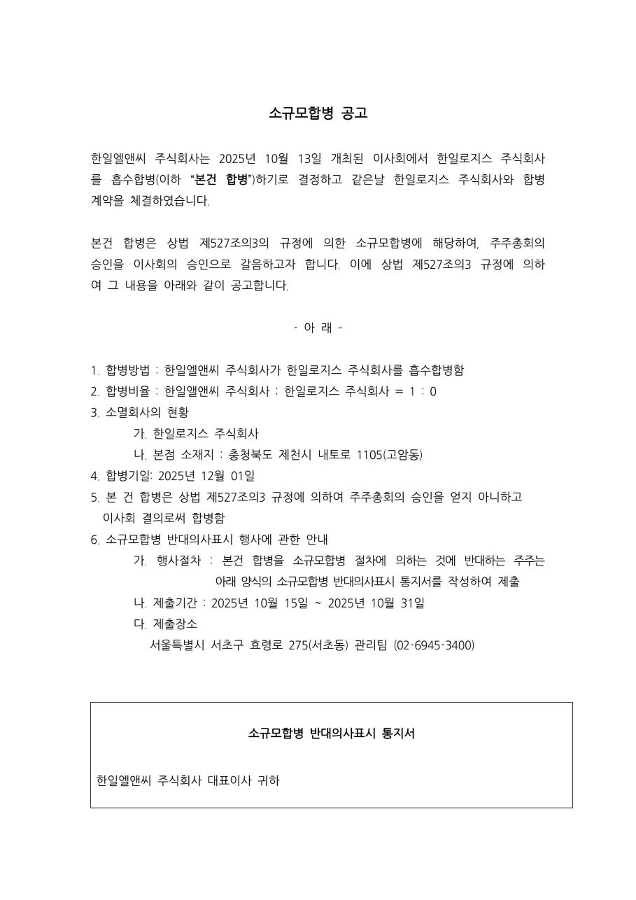- 한일L&C에서 알리는 소식입니다.